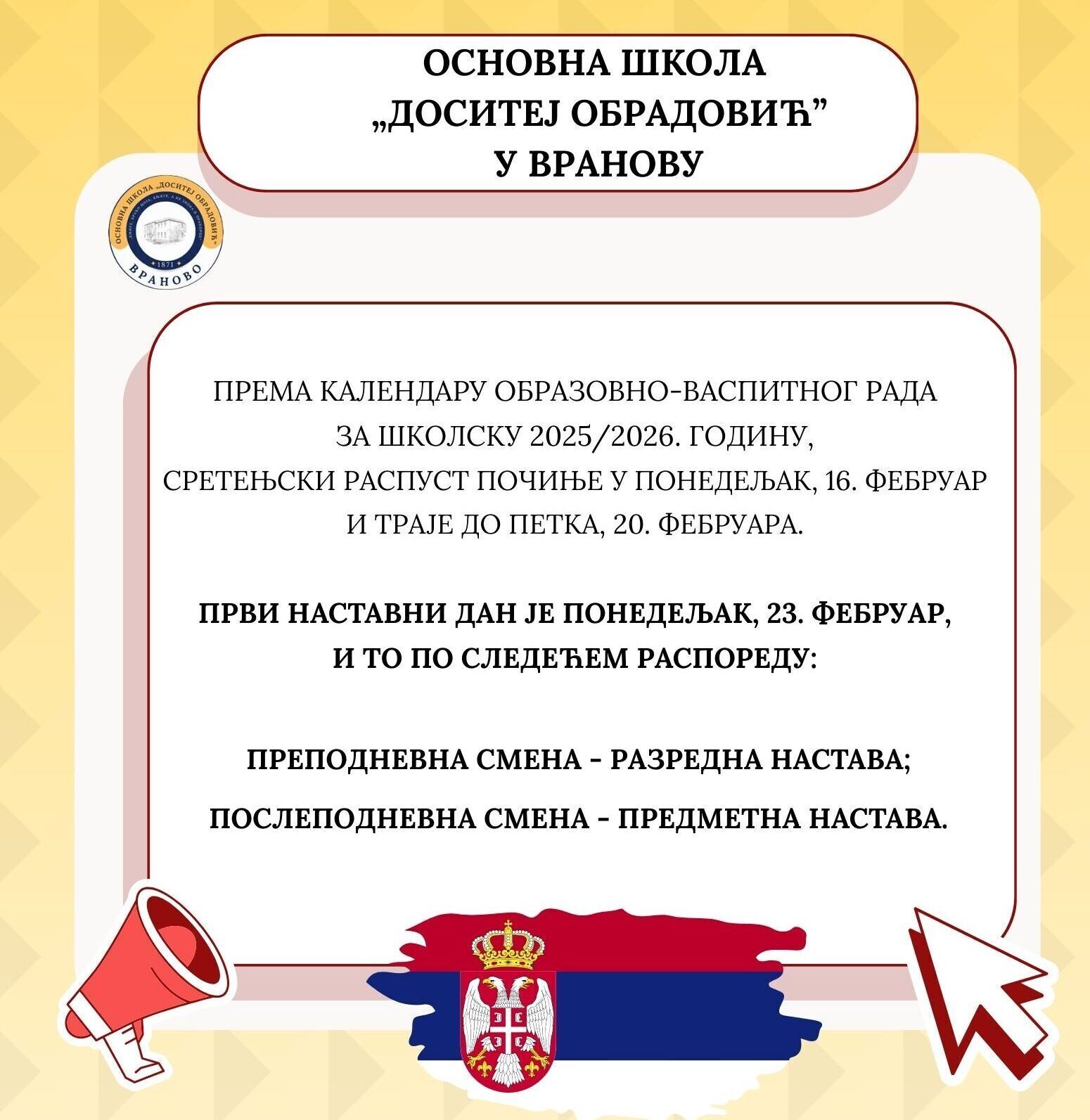Распоред звоњења за школску 2025/2026. годину